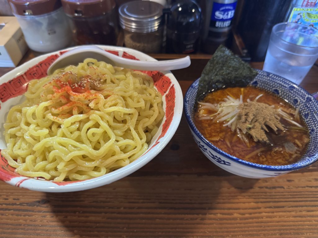味は良好。辛かったのですが、辛さの中にうまみもあって美味しかったです。つけダレの中に叉焼・メンマ・ネギ・タマゴ ( 半分 ) ・モヤシ等が入っていました。